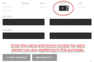 Click ‘Choose Tickets’ once all required fields have been completed. - Add the number of tickets you need to purchase for the check-in time you prefer. The booking system will add two ‘Registrant’ fields for each ticket you purchase. Add each attendee’s name and phone number. You can use legal name, scene name, FetLife name, CPI member name, or CPI member number in the name field – whatever you prefer. Once you have completed all of the fields on this page, click ‘Add Services’ to proceed to the next page.