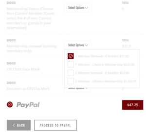 - CPI members who wish to renew their membership can do so during the ticket purchase if they wish. This is an optional add-on service. If a non-current member chooses to renew their membership during the ticket purchase, they should select the options for ‘Current Member’ in the drop-down lists for ‘Membership Status’ and ‘Guests’.Note that new memberships may NOT be purchased using this option. This is only for renewals of existing memberships.